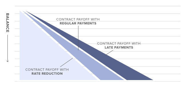 Your rate can drop from the contract rate to as low as 14% minimum APR after all reductions. The monthly payment amount remains the same with each rate reduction. Individual amortizations and savings will vary depending on terms and length of the contract. All customers with interest rates less than or equal to 14% do not qualify for Rate Reduction Rewards.